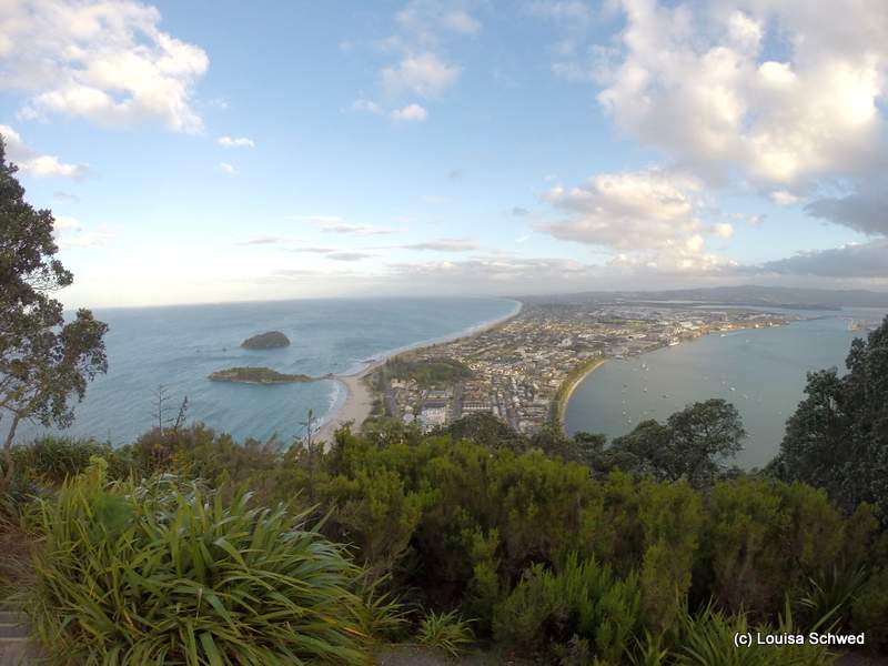 Das war’s dann mit arbeiten. Leider war auf der Plantage keine Arbeit mehr, deswegen mussten wir die Zeit irgendwie überbrücken. Zunächst ging es zum Mt Maunganui hoch, einem Berg in der Nähe, von dem man eine super Aussicht auf Tauranga und die Bay of Plenty hat. Dieser Berg ist Ziel vieler Sportbegeisterer. Beim hochwandern kommen ständig Leute entgegen gesprintet oder man wir von Leuten überholt, die sich die Qual antun und die vielen Treppen bzw. Hänge hochlaufen. Oben angekommen wird man dann mit einem tollen Blick belohnt, der bei Sonnenuntergang noch schöner ist.