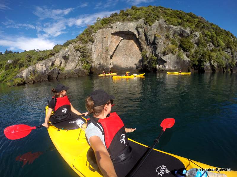 Am nächsten Tag buchten wir eine Kayak Tour zu Maori Carvings, die nur über das Wasser zu erreichen sind. Die 4-stündige Tour war auch ein absolutes Highlight. Seelenruhig paddelt man in einer kleinen Gruppe über den See und genießt auch hier die tolle Aussicht. Interessant waren auch die Carvings im Stein. Da sie nur schwer zu erreichen sind waren auch nicht viele Leute vor Ort.